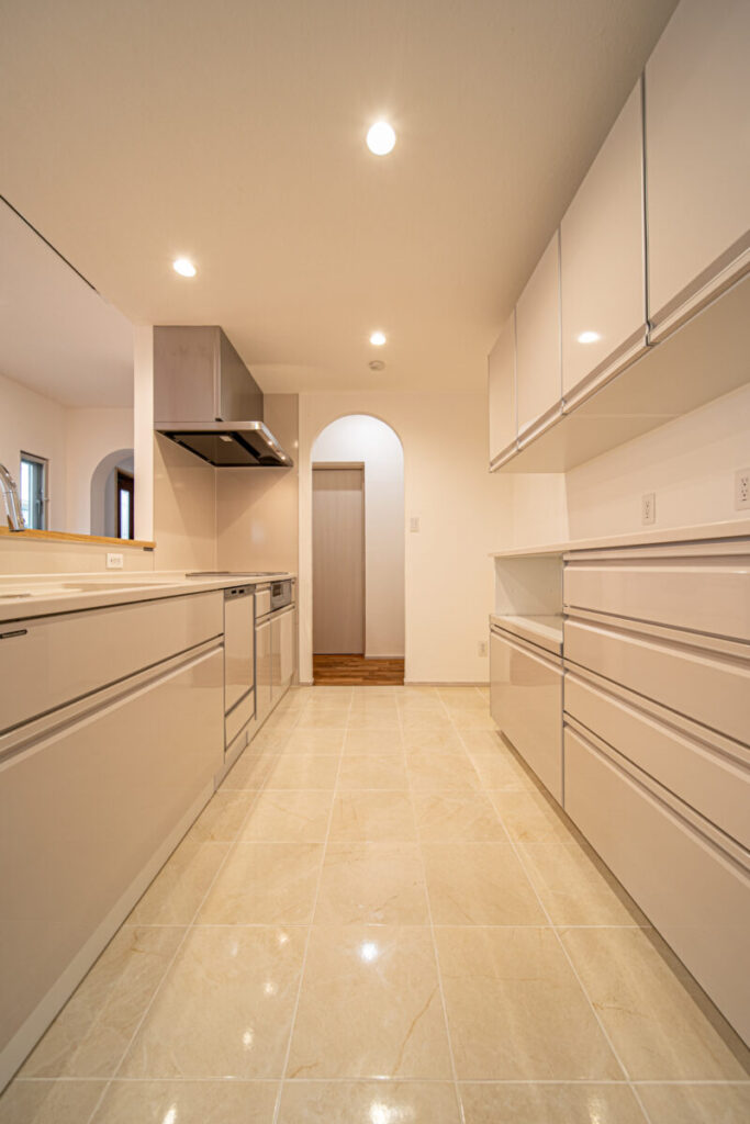上品な光沢が魅力。タイル床でつくる清潔感あふれるキッチン空間
